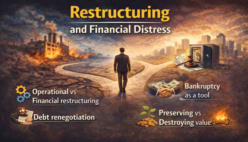 Financial distress is not a failure of strategy, but a failure of capital allocation that demands immediate correction. This tutorial explains how disciplined companies diagnose operational versus financial problems, execute surgical restructuring, and when necessary, use bankruptcy not as surrender but as a strategic tool to reorganize. We detail the creditor negotiation process, the preservation of franchise value, and how restructuring decisions vary across a company's lifecycle. Through contrasting examples, you will learn why proactive, transparent restructuring preserves value while denial and delay destroy it.