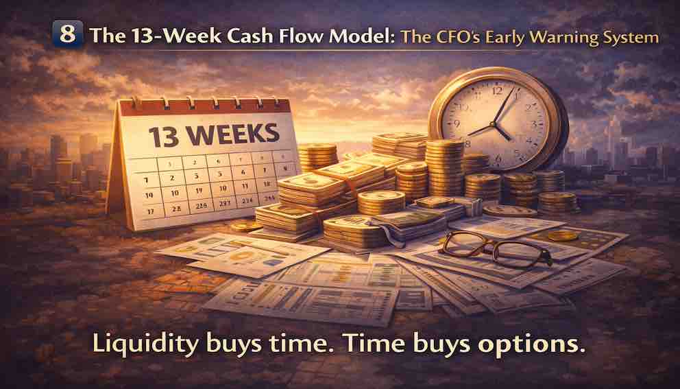 The 13-week cash flow model is one of the most practical and powerful tools in financial management because it answers a single, essential question: will the organization have enough cash to survive the coming weeks? While long-term forecasting prepares leaders for multiple possible futures, short-term liquidity management ensures the company lives long enough to respond to whichever future unfolds. This tutorial explains how CFOs build, maintain, and use a 13-week cash flow model as an early warning system during uncertainty, downturns, and operational stress. Through detailed examples, we explore cash runway, debt maturities, working capital discipline, vendor prioritization, governance oversight, and the limitations of the model itself. The central lesson is clear and fully explained: liquidity buys time, time preserves options, and options sustain strategy.