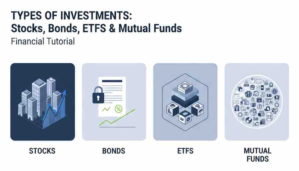 Confused by investment jargon? This clear guide breaks down the four essential building blocks: Stocks (ownership), Bonds (loans), ETFs, and Mutual Funds. Learn how each works, its unique role in a portfolio, and the pros and cons for beginners. With relatable examples and a simple framework, you'll know how to start combining these tools to build a diversified portfolio that matches your goals.
