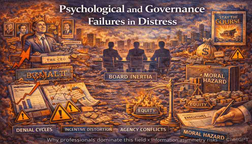 Corporate financial distress rarely begins with a sudden collapse; it begins with subtle psychological biases, governance weaknesses, and distorted incentives that quietly reshape decision-making inside the firm. Long before bonds trade at distressed levels or restructuring frameworks such as Chapter 11 or the Insolvency Act 1986 are invoked, executives and boards make choices shaped by optimism, loyalty, and institutional design. This tutorial examines how CEO overconfidence, board inertia, agency conflicts, cultural conformity, and moral hazard gradually push companies toward crisis. Through the continuing story of Precio Components, we explore how intelligent leaders can drift into distress without recognizing it. Understanding these behavioral and governance failures is essential for investors, directors, and managers who want to prevent crisis rather than merely navigate it.