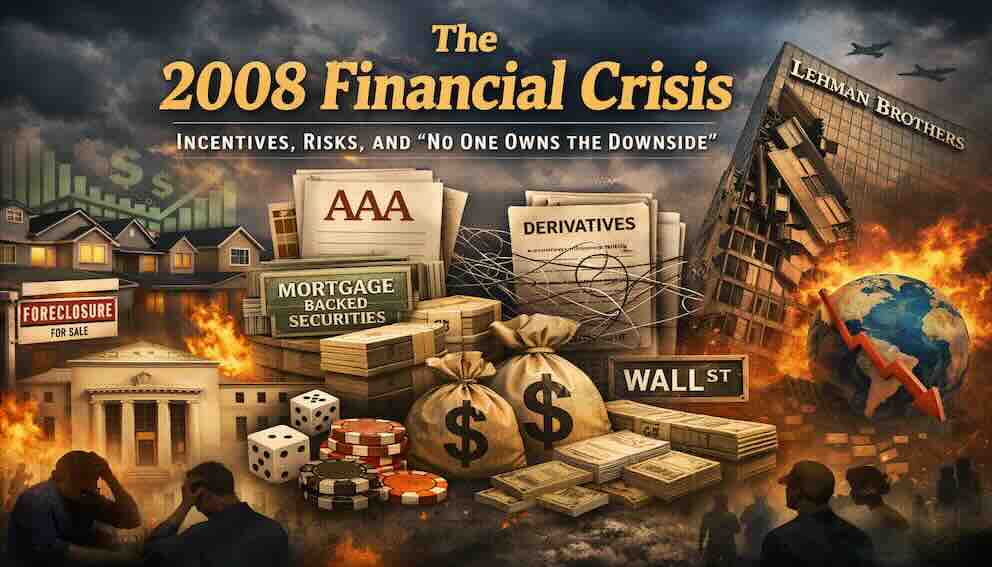 The 2008 Global Financial Crisis was not simply a story of bad loans or falling house prices. It was a story about incentives that encouraged risk while allowing people to avoid responsibility for failure. Banks made loans they did not intend to keep. Investors bought securities they did not fully understand. Rating agencies gave high grades to products built on fragile foundations. At every stage of the financial chain, profits were privatized while losses were quietly shifted elsewhere. This tutorial explains how the crisis unfolded, why "no one owned the downside," and what this failure teaches us about risk, psychology, and regulation.